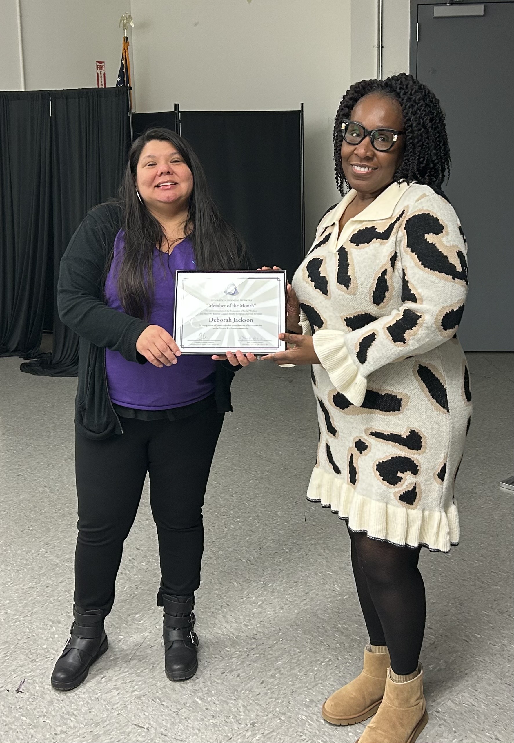 Deborah Jackson has worked at MCDHS for more than 15 years. She is currently an investigator in SIU. Deborah is being recognized for her tremendous efforts as chair of the FSW Women’s Committee. Recently, she organized the gift project for almost 500 students at RCSD #42, in which each child was given a gift of their choice. In the photo below, Deborah (on the right), is presented her award by FSW President Christina Christman. Please join us in congratulating Deborah Jackson for this very deserving honor!